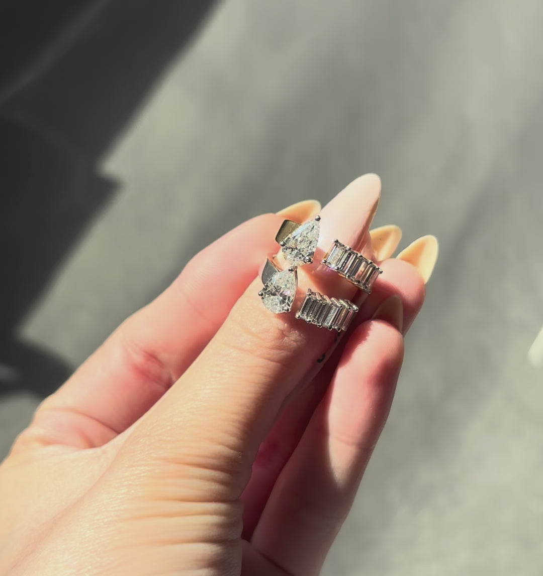 This ring features a vivid emerald pear centerpiece, framed by a sleek, elongated gold silhouette that enhances its natural brilliance. A refined balance of color, cut, and clarity - crafted to stand out effortlessly.